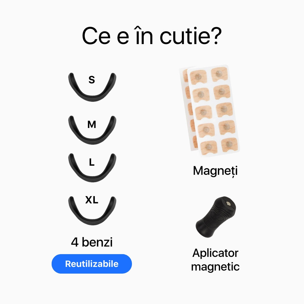 - 4 mărimi de benzi magnetice (S, M, L, XL) – pentru o fixare sigură și confortabilă pe orice tip de nas